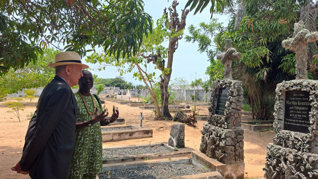 Accueilli chaleureusement à son arrivée à la mairie à Aného, chef-lieu de la commune Lacs 1, et après un bref échange avec Monsieur le Maire, l’Ambassadeur Fischbach et sa délégation ont été conduits en ville pour une visite touristique des vestiges allemands dans la localité. La relation entre Aného et l’Allemagne est héritée de la période coloniale, lorsque l’Allemagne a établi un protectorat sur la région du Togo, et a fait d’Aného la capitale du Togo de 1887 à 1897. Durant cette période, l’administration coloniale allemande a développé ses infrastructures, en mettant en place des systèmes scolaires et de santé ainsi que des mobiliers et bâtiments dont certains sont démeurés à ce jour à Aného.